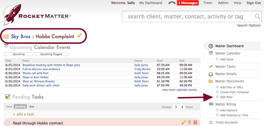 When a call comes in, or you are getting ready to make a call, first navigate to the necessary matter. Then, click the ‘Add note’ button in the right-hand navigation menu.