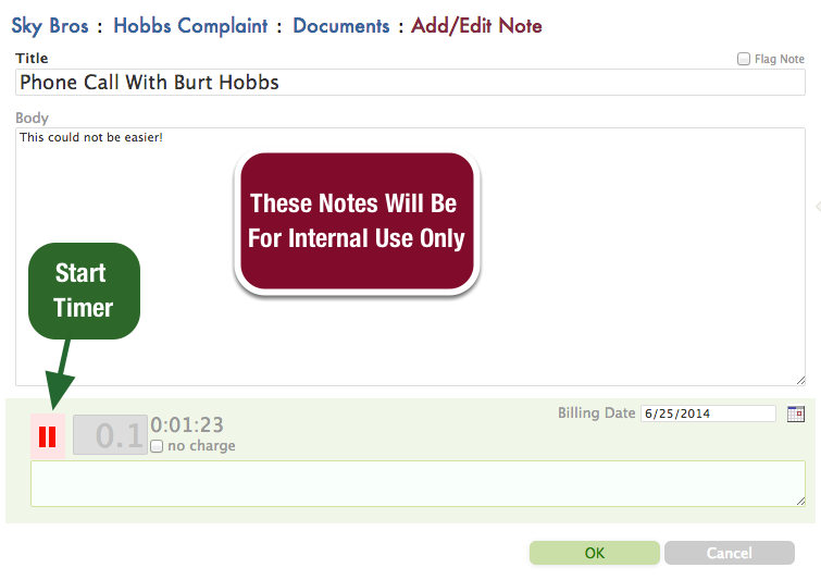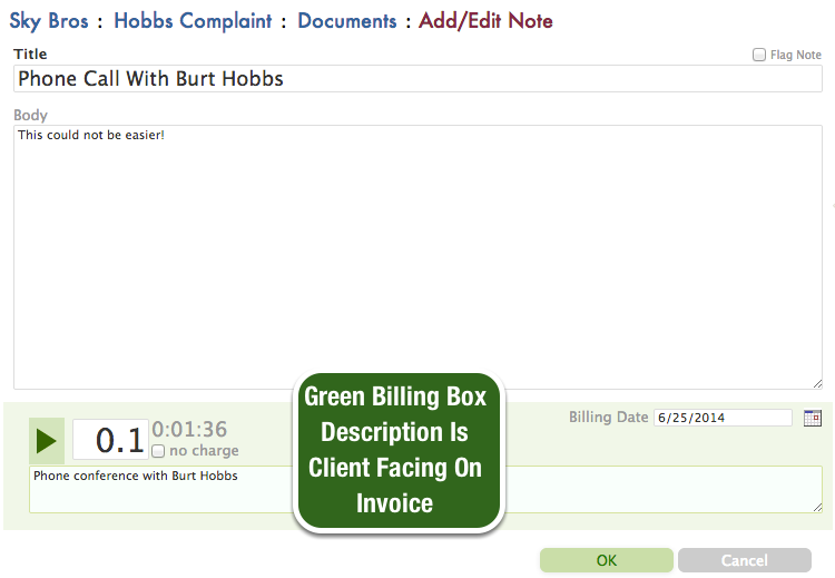 Lastly, stop the timer, title the note and give it a billing description for the invoice (the notes you take will only be internal; anything written in the green billing box will be client facing on the invoice). Hit ‘OK’ and move on to your next task with confidence that you have tracked as much time on the call as possible.