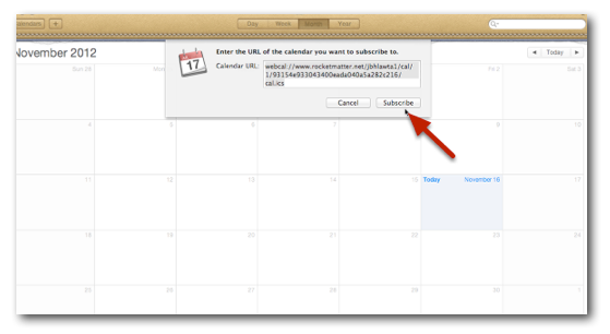 3. Click on the URL/Internet Calendar link starting with ‘webcal://’. Your outside calendar will automatically open asking to subscribe to Rocket Matter’s calendar.