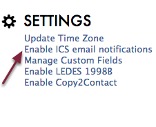 Rocket Matter’s ICS notifications automatically email your client with the event file when they are added as an attendee to the event. To enable this feature, go to the Admin section and click ‘Enable ICS Notifications’.