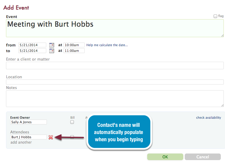 Once this is enabled, any contact stored in Rocket Matter can be added as an attendee to a calendar event.