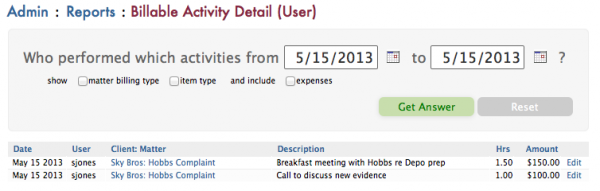 Clicking on the hyperlink of total hours billed total will take you directly to the billable activity report. From this report, in addition to your own time, you can track others. The report can be run for any date range and will show all activities.